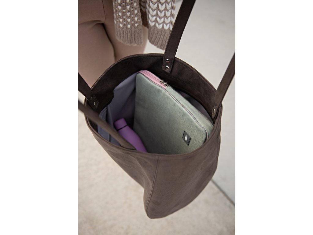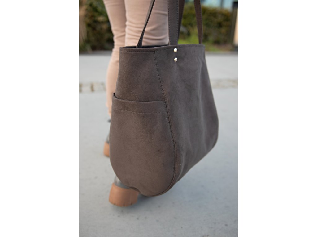 Elegantní taška z hnědé hrubé tkaniny. Uvnitř je silná bavlněná podšívka, a tři kapsy - dvě otevřené a jedna se uzavírá pomocí zipového uzávěru. Je možné ji nosit volně přes rameno nebo v ruce. Má úžasnou kapsu na boku.