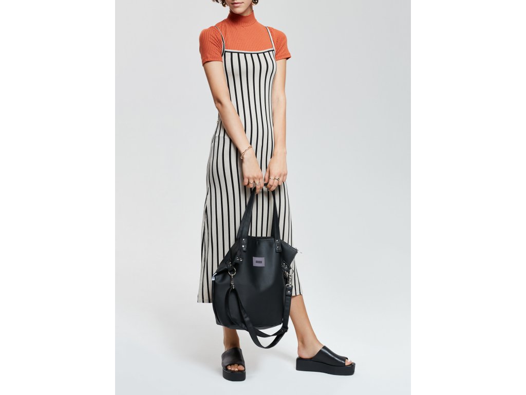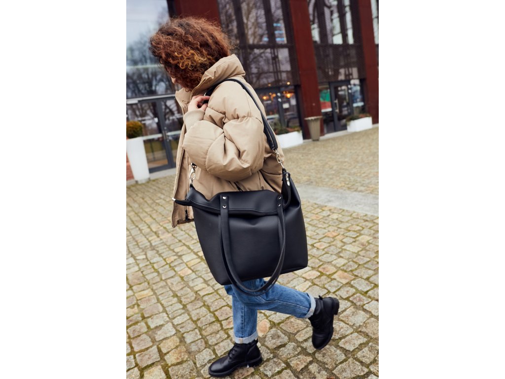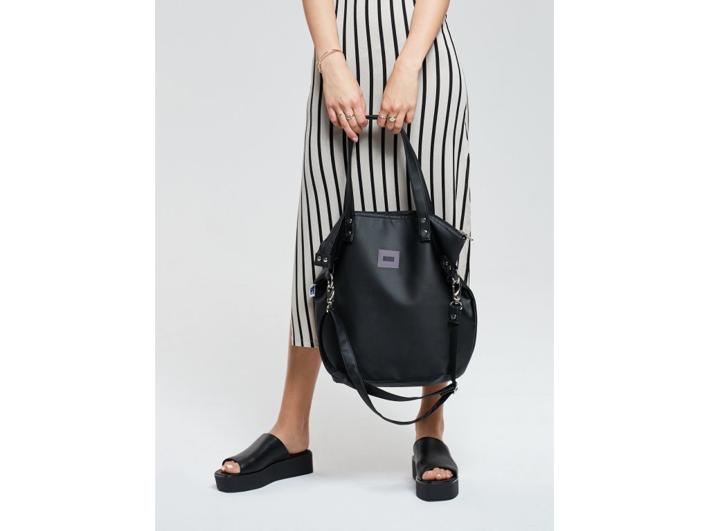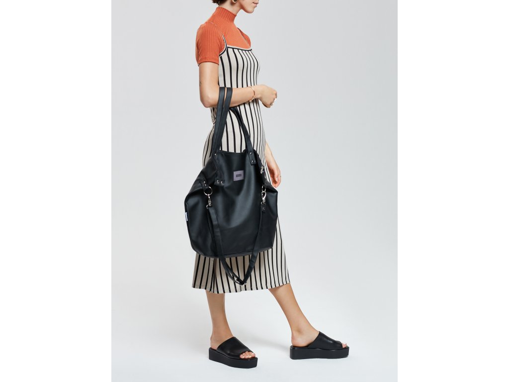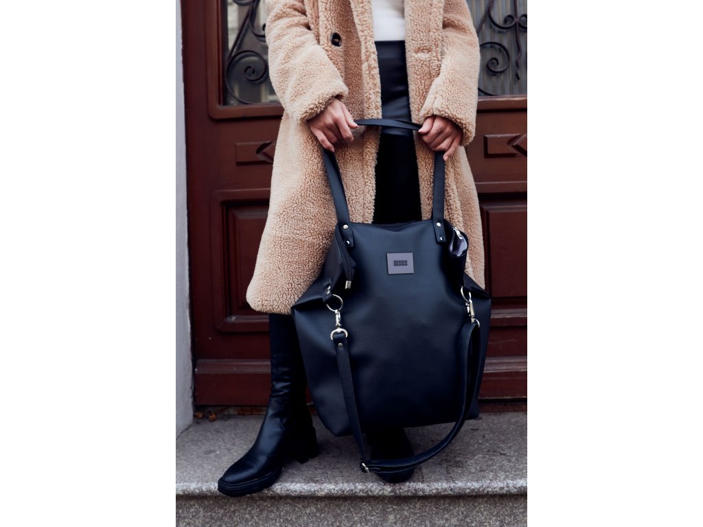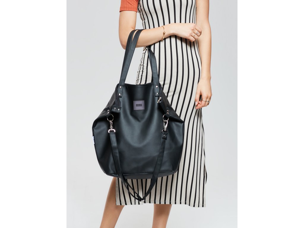 Velká taška z eko kůže v barvě černé. Uvnitř je silná bavlněná podšívka v barvě červené, a tři kapsy - dvě otevřené a jedna se uzavírá pomocí zipového uzávěru. Taška má pevný popruh. Je přidělána na čtyřech nýtech (uších) z eko-kůže. Je možné ji nosit volně přes rameno nebo si nastavitelným popruhem ze stejného materiálu upravit tašku pro nošení diagonálně (crossbody).