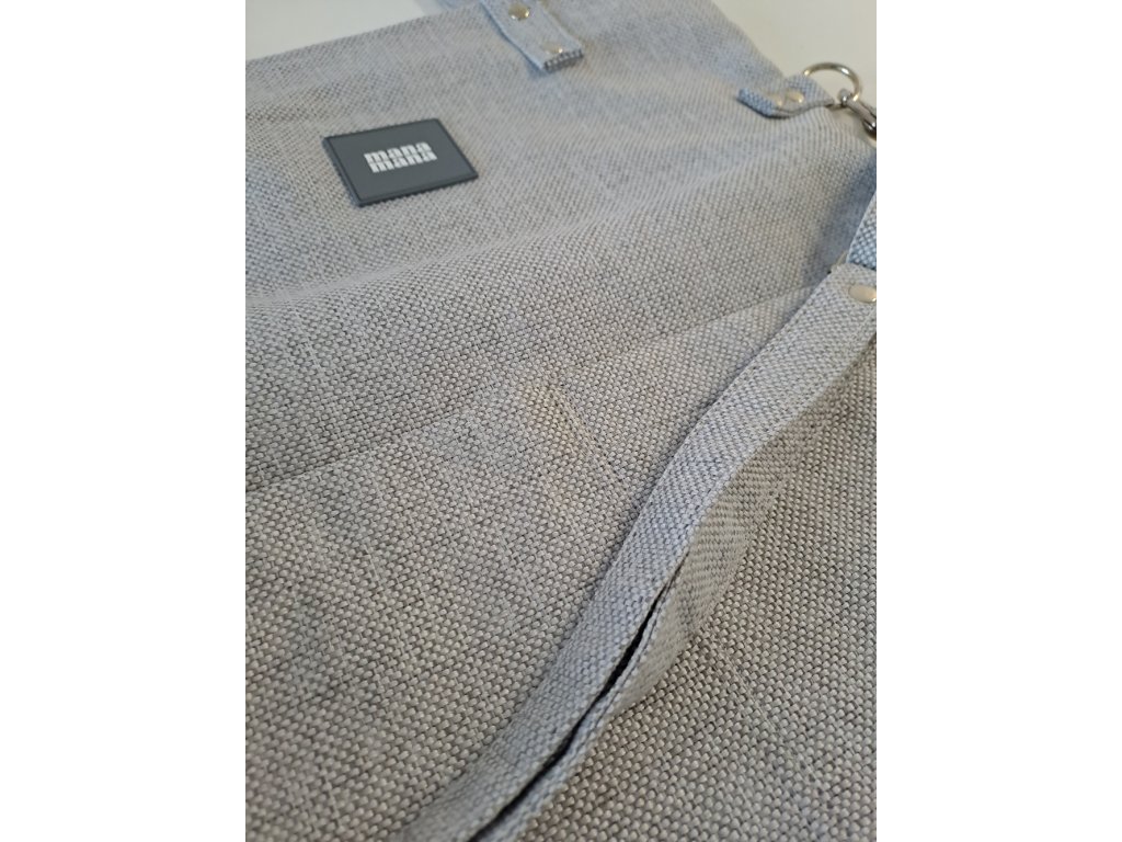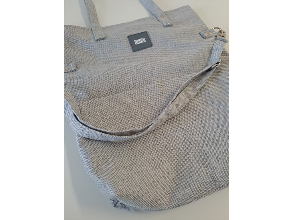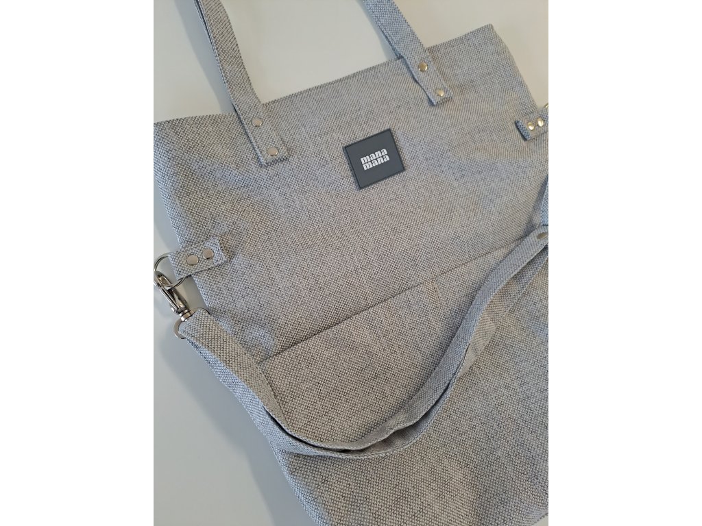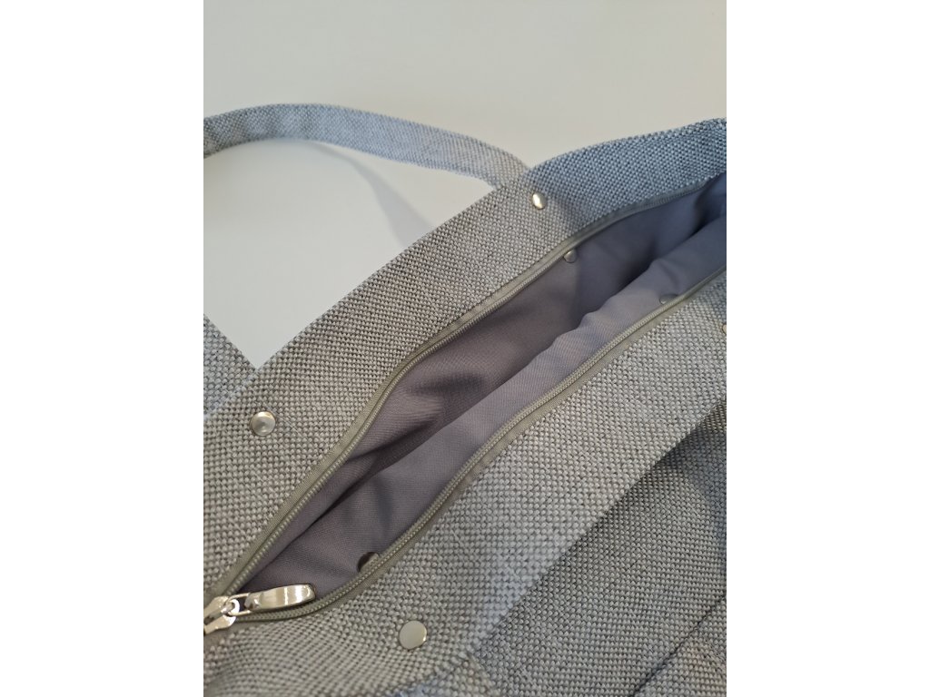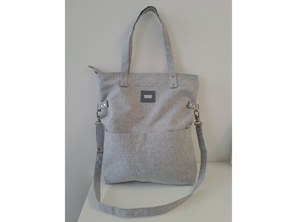 Střední módní taška vyrobená hrubé tkaniny v světle šedé. Uvnitř je silná bavlněná podšívka, a tři kapsy - dvě otevřené a jedna se uzavírá pomocí zipového uzávěru. Taška má pevný popruh. Je přidělána na čtyřech nýtech (uších) ze stejného materiálu jako je taška. Je možné ji nosit volně přes rameno nebo si popruhem upravit tašku pro nošení diagonálně (crossbody). Je měkká, pojme neuvěřitelné množství věcí a skvělá pro každodenní nošení do práce nebo školy. Taška pojme objem do 3kg (pro každodenní nošení), čas od času se může také přetížit na 5-6kilovou zátěž.