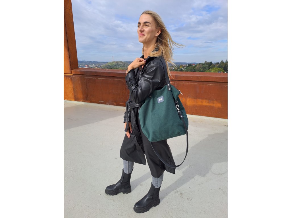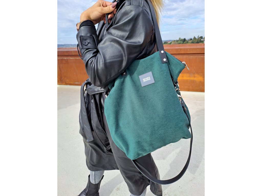 Střední taška z eko semiše v barvě smaragdové. Uvnitř je silná bavlněná podšívka v barvě šedé, a tři kapsy - dvě otevřené a jedna se uzavírá pomocí zipového uzávěru. Taška má pevný popruh. Je přidělána na čtyřech nýtech (uších). Je možné ji nosit volně přes rameno nebo si nastavitelným popruhem ze stejného materiálu upravit tašku pro nošení diagonálně (crossbody). Je měkká, pojme neuvěřitelné množství věcí a skvělá pro každodenní nošení do práce nebo školy. Taška pojme objem do 3kg (pro každodenní nošení), čas od času se může také přetížit na 5-6kilovou zátěž.