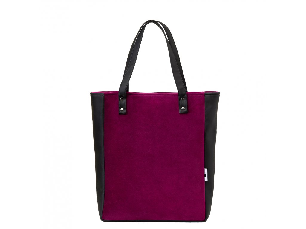 Velká taška ze fialového eko semiše a černé eko kůže. Uvnitř je silná bavlněná podšívka, a tři kapsy - dvě otevřené a jedna se uzavírá pomocí zipového uzávěru. Taška má pevný popruh. Je přidělána na čtyřech nýtech (uších) z eko kůže. Je možné ji nosit volně přes rameno nebo v ruce. Je měkká, pojme neuvěřitelné množství věcí a skvělá pro každodenní nošení do práce nebo školy. Taška pojme objem do 3kg (pro každodenní nošení), čas od času se může také přetížit na 5-6kilovou zátěž. NEMÁ CROSSBODY UCHO!